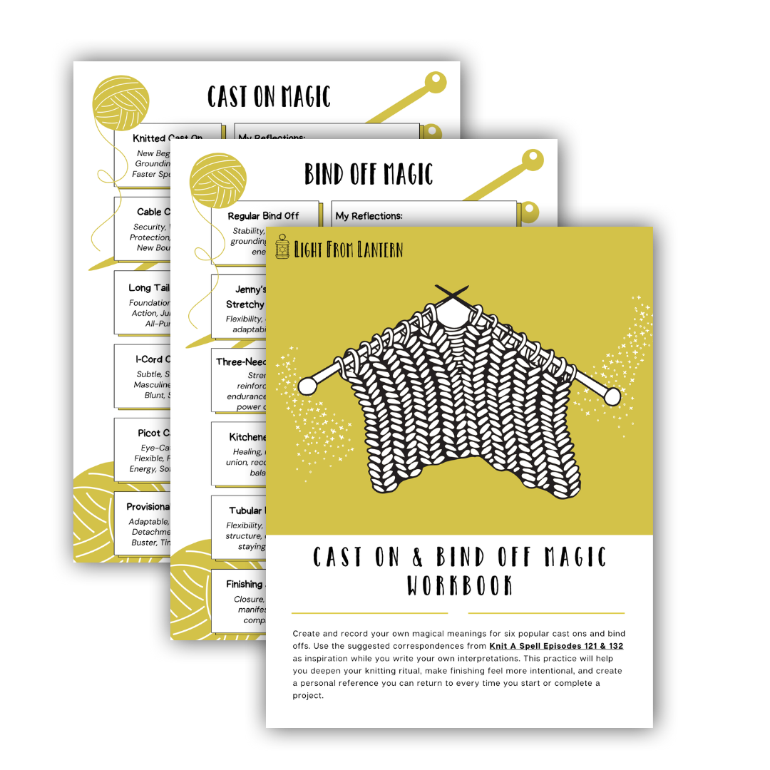 Create and record your own magical meanings for six popular cast ons and bind offs. Use the suggested correspondences from Knit A Spell Episodes 121 & 132 as inspiration while you write your own interpretations. This practice will help you deepen your knitting ritual, make finishing feel more intentional, and create a personal reference you can return to every time you start or complete a project.